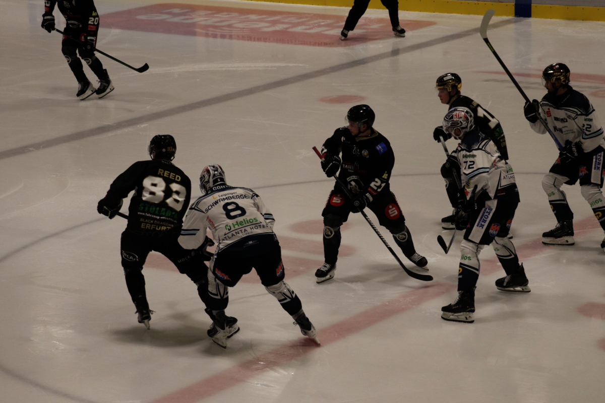 Vor 912 Zuschauern in der Erfurter Eishalle hatten die Gastgeber den besseren Start ins Spiel und gingen in der 10. Minute durch Enzo Herrschaft in Führung. Vorausgegangen war ein Scheibenverlust im eigenen Drittel, den der Erfurter Stürmer routiniert zu nutzen wusste. In der 13. Minute erhöhte die Black Dragons nach einem gut vorgetragenen Konter auf 2:0 (Maurice Keil). Im zweiten Drittel war es Erfurts Import-Finne Santeri Haraala, der die Führung weiter ausbaute. Er lief mit der Scheibe über das komplette Spielfeld und schloss mit einem Schuss aus zentraler Position zum 3:0 ab. In der letzten Minute des zweiten Spielabschnittes konnte Darek Hejcman auch die Gäste aufs Scoreboard bringen. Nach Vorarbeit von Johan Eriksson und Chad Bassen traf er im Powerplay ins Erfurter Tor.